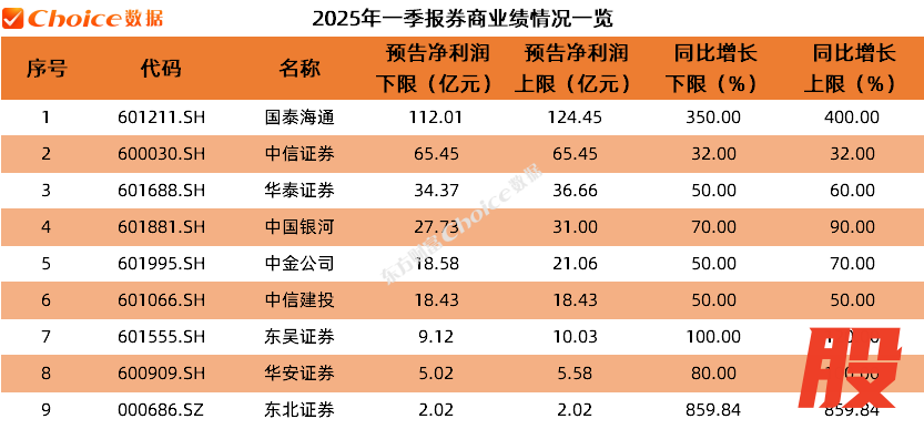 截至4月22日,共有9家上市券商公布了2025年一季度业绩预告。国泰海通预告净利润范围最高,为112.01亿元-124.45亿元;中信证券位列第二,预告净利润65.45亿元。国泰君安证券和海通证券合并之后,业绩总额远远超过了“券商一哥”中信。