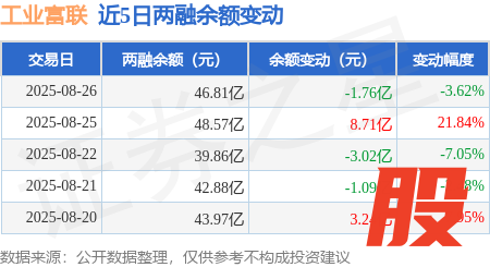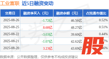 本站消息,8月26日,工业富联(601138)融资买入11.37亿元,融资偿还13.09亿元,融资净卖出1.72亿元,融资余额46.56亿元,近20个交易日中有14个交易日出现融资净买入。